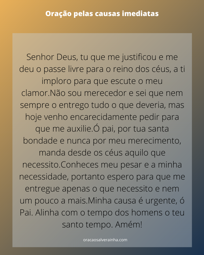 A oração pelas causas imediatas funciona com qualquer tipo de necessidade. Se precisa de dinheiro, saúde, amor ou qualquer outra coisa, saiba que isso pode ser suprido por meio desta simples oração.