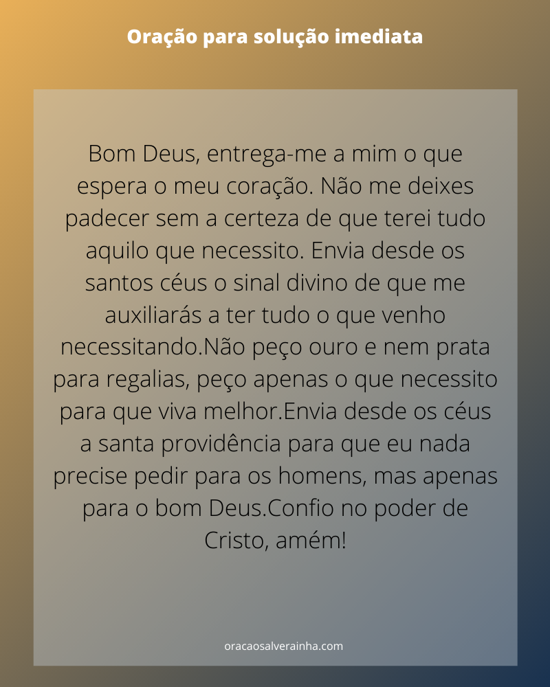 A oração para solução imediata pode te ajudar a conseguir algo com muita rapidez. Chega de ficar ansioso(a) e preocupado(a) sobre o que virá, basta orar e esperar que você será atendido(a) por Deus!